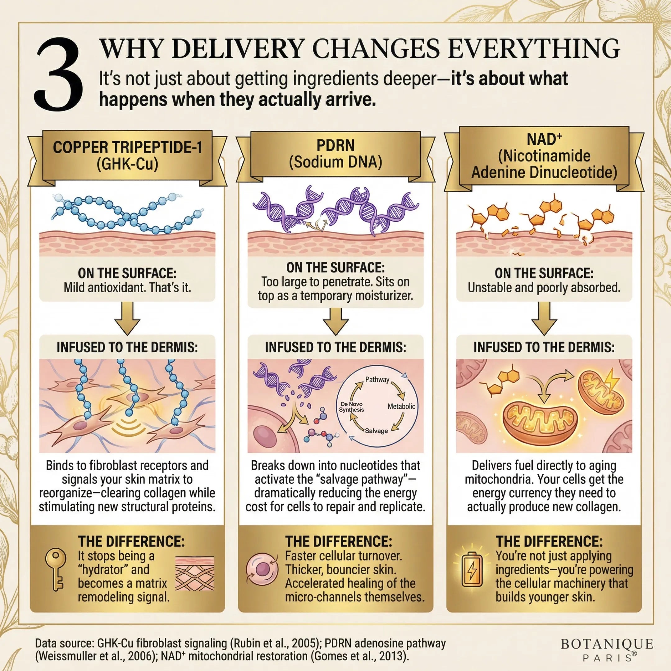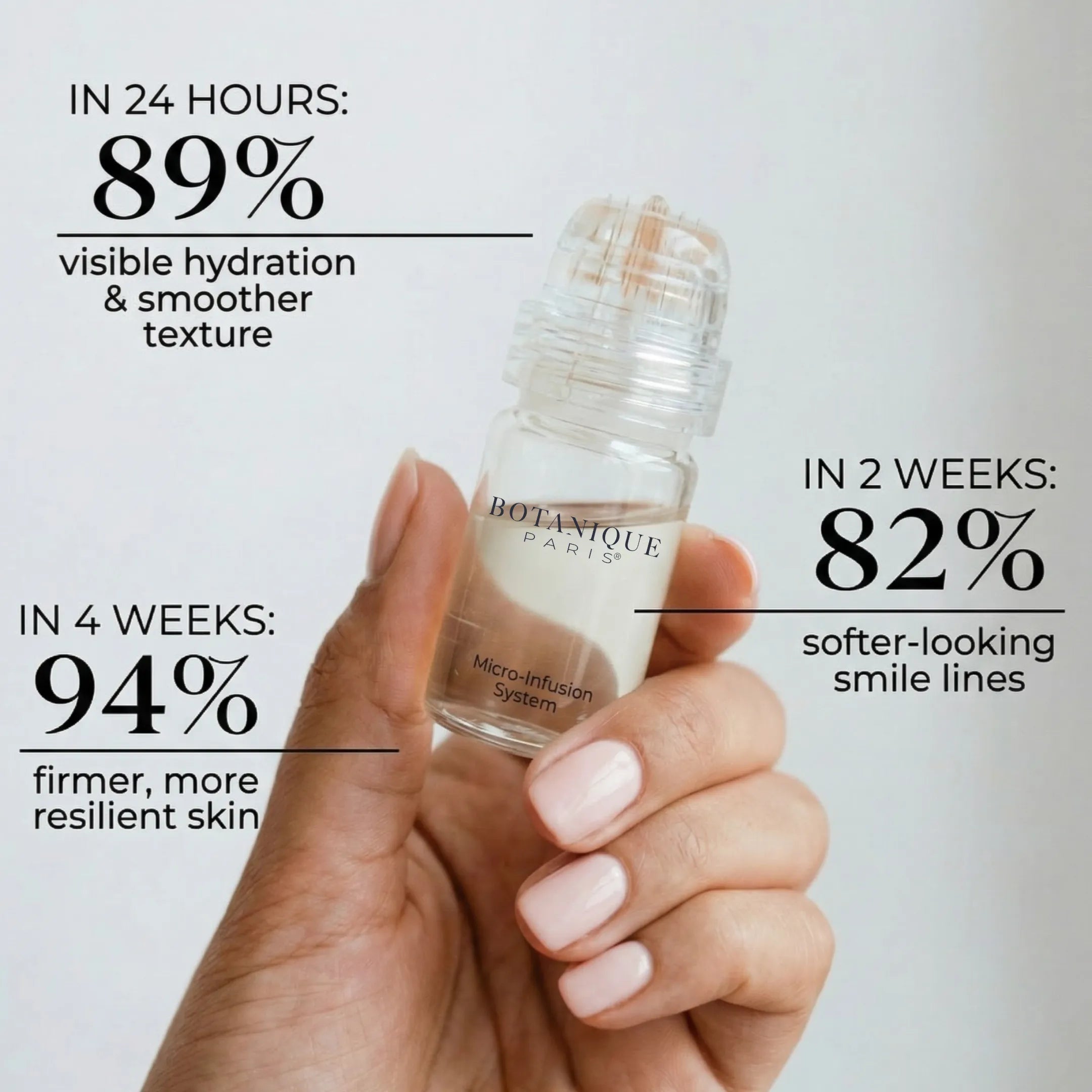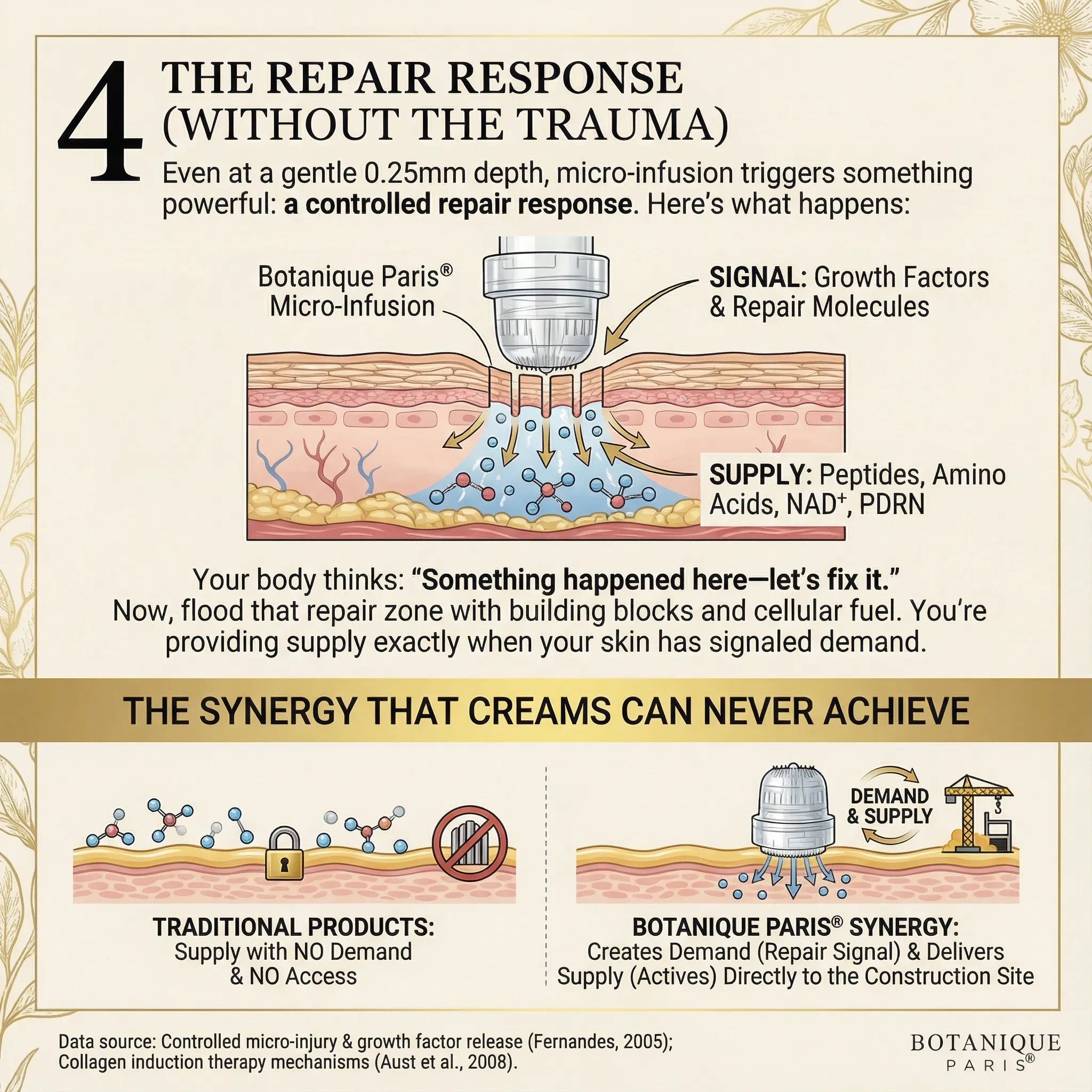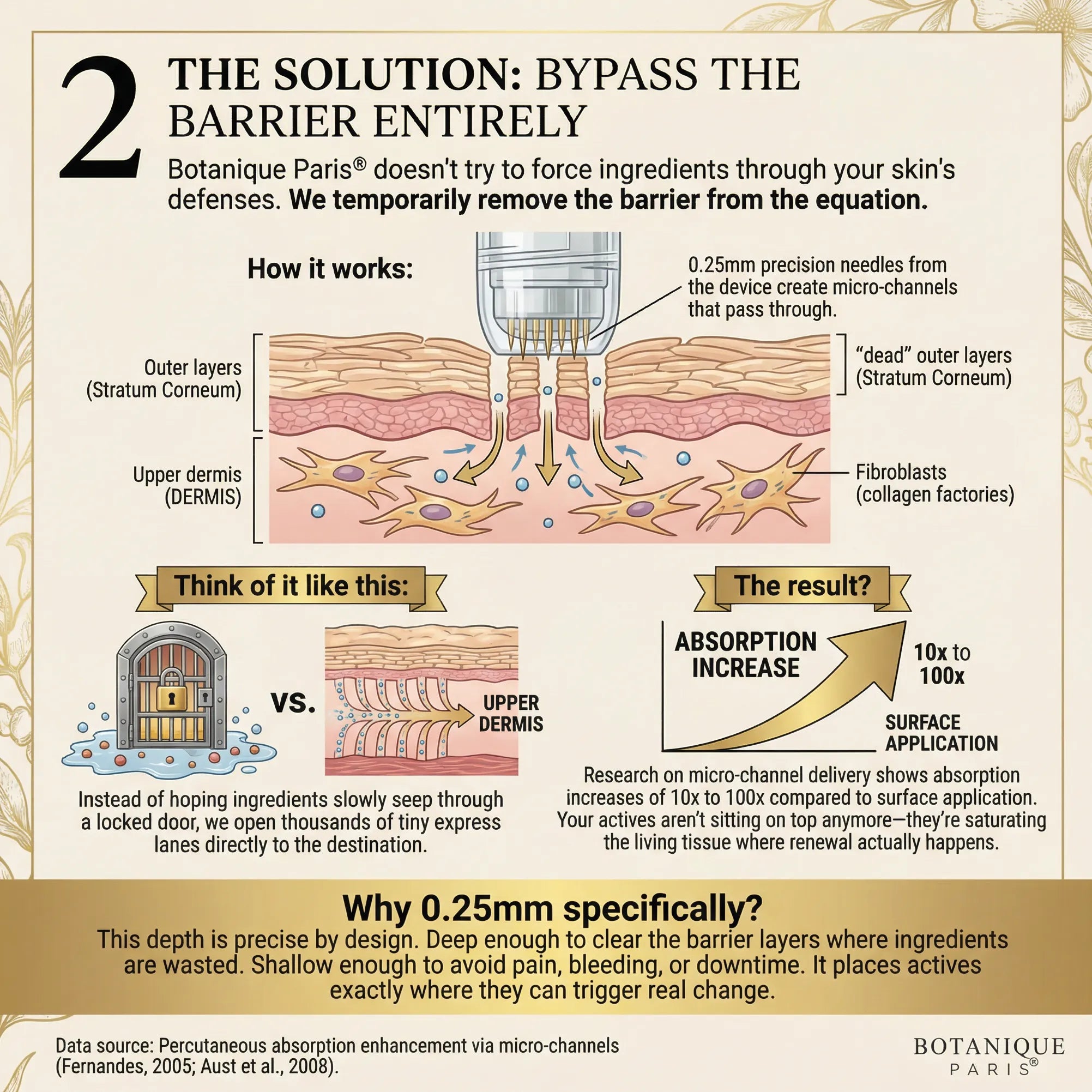 Traditional anti-aging creams sit on top of your skin, never reaching the layers where fold depth and texture issues become visible. Botanique Paris® Micro-Infusion works differently—precision 0.25mm delivery creates temporary micro-channels that help 30 clinically-studied actives reach beyond the surface barrier.